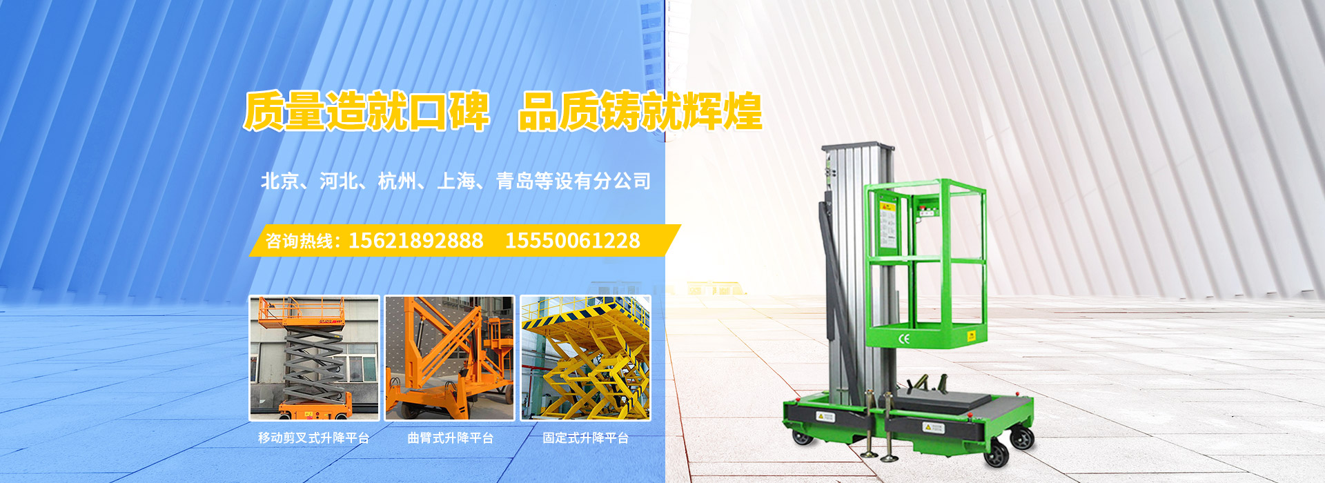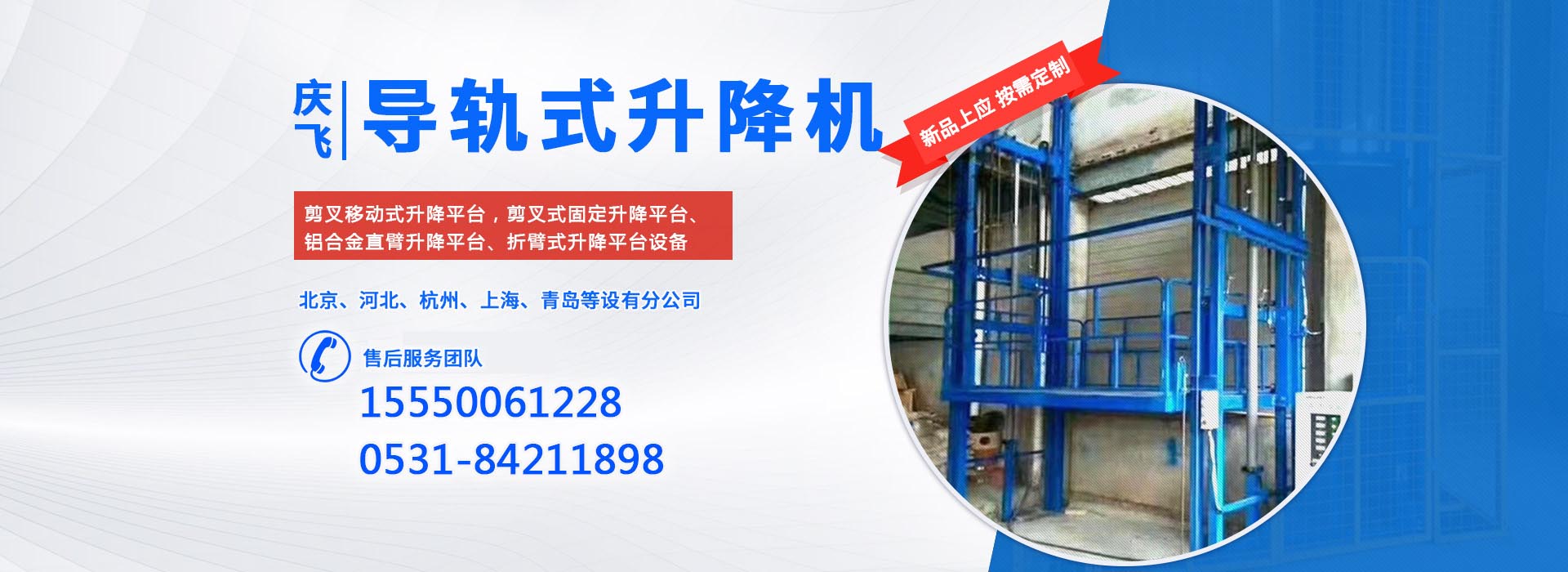 濟(jì)南慶飛機(jī)械設(shè)備有限公司目前專心致力于液壓升降平臺(tái)領(lǐng)域。公司主要產(chǎn)品有:剪叉移動(dòng)式升降平臺(tái),剪叉式固定升降平臺(tái)、鋁合金直臂升降平臺(tái)、折臂式升降平臺(tái)、曲臂式升降平臺(tái)、車載式升降平臺(tái)、牽引式升降平臺(tái)、自動(dòng)行走式升降平臺(tái)、移動(dòng)式固定式登車橋、桅柱式鋁合金升降平臺(tái)、鋁合金升降舞臺(tái)、固定軌道臺(tái)面旋轉(zhuǎn)式升降平臺(tái)等,產(chǎn)品廣泛適用于電力、通訊、路燈、交通、交警、建筑裝簧、園林、廣告、高速公路、大型廠礦企業(yè)等領(lǐng)域,還可根據(jù)用戶的需求設(shè)計(jì)制造包括特殊尺寸、承載能力、防爆電器的液壓升降臺(tái)。